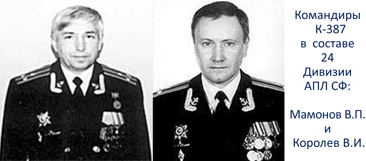 В декабре 1985 года ПЛ К-387 (экипаж в/ч 81202, командир - капитан 2 ранга Мамонов В.П.) была включена в состав формирующейся 24 дивизии атомных подводных лодок Северного флота (К-387 в составе дивизии с 1985 по 1991 год). В 1989 году ПЛ К-387 (командир - капитан 2 ранга Королев В.И.) заняла 1 место по минной постановке, а также 2 место по атаке отряда боевых кораблей.