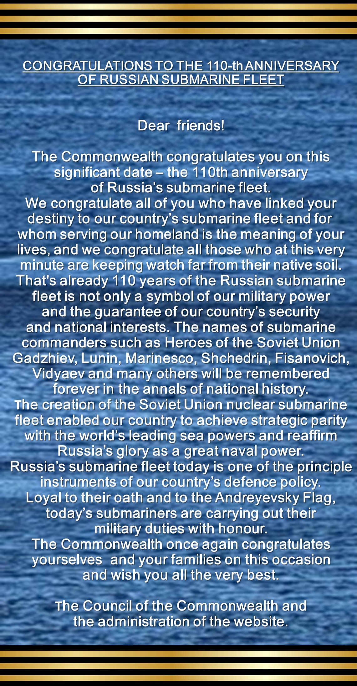 04.06.2025 исполнилось 65 лет вице-адмиралу Воложинскому А.О. От всей души поздравляем Вас! Подробнее...Поздравляем с юбилеем Глыб Н.В.